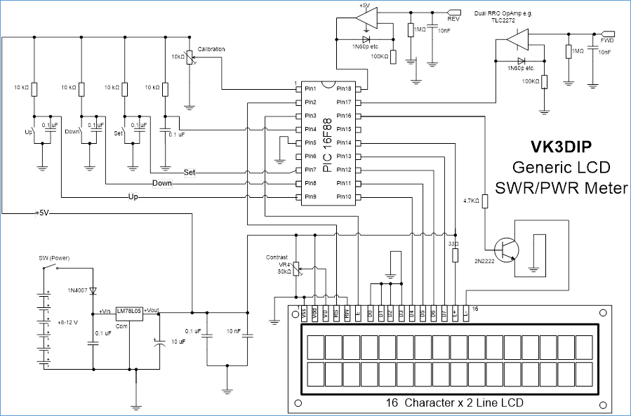 At the end of the day there is a limit to just how precise you can make something with an analog meter, so I went looking around on the web for a something that was not too complex but which could provide that extra precision. I quickly discovered a whole host of different designs out there most of which were using some sort of Microchip or Atmel microcontroller to do the heavy lifting. While some people have semi-religious wars about these two families of devices, I tend to be very pragmatic about this, as really the devices have very similar capabilities, so I tend to just use whatever happens to be on sale this week. I suppose now that Microchip has bought Atmel these chip wars will be a thing of the past. Anyway, one of the more common designs for digital SWR Power meters I found out there used the Microchip 16f88, and I happened to have a few of these from a previous project, so that was the design I followed up. As it turned out this was not a straight forward thing. As far as I could determine, this original design came from a Netherlands amateur radio group called VRZA (callsign PI4ZLB) and in particular one member PA0EJH. I am not particularly sure about this because while this is referenced in a number of other web sites, the original PI4ZLB site seems to no longer contain the detail it once did. What I do know is that several people from a large number of places including India and Romania, built versions of this meter, and in the Indian case the online company FoxDelta actually marketed a kit of it. Strangely the Indian company published details of their kit etc. in a Greek amateur radio magazine! There is clearly a story of who did what first here but for the moment the important thing to me was that there were several PCB patterns available so I could simply produce a board, and most people seemed to agree it worked fine. If you want to chase these up further have a look at the following URLs for starters.