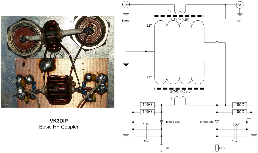 The two main power determining factors here are the thermal dissipation in the cores, and the maximum rectified voltage out. The thermal dissipation ability gets better as the volume of ferrite increases, so normally large power implies large cores. The transformer effectively across the output is the critical one with respect to power handling, and as I had a number of smaller (T50-43) toroids (which are considerably cheaper than larger toroids) I ended up using two smaller cores taped together for this more critical transformer, to handle my expected 120W max. The voltage out in this meter design also has to be less than 5Vdc so as not to top out in the Op amps, With the 22 turns specified here I calculated that this design would have a coupling value of around 26.9dB and would thus produce (just) less than the 5V at the maximum 120 watts that I expect to measure. I will include the excel spread sheet I used to do these calculations on YagiCAD.com.