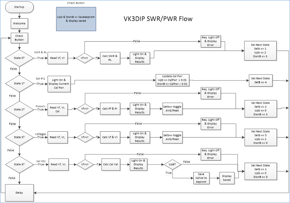 Pressing the Up button from SWR mode puts us into Power mode, and displays on the two lines power forward and reverse in watts and the current value of the calibrate pot. Basically the calibrate pot will show a value somewhere between 512 and 1538, with the centre value being nominally 1000. The way it works is there is an implied decimal point so the range of the calibrate is nominally between 0.512 and 1.538 with a nominal centre of 1.000. The meter calculates the power by multiplying the read count (either the average over 63 samples over about 1 second, or the peak sample over that same time, depending if average or peak is selected using the set button while in power mode) by a special value set and recalled from eeprom that converts the count to watts. This value will nominally only be truly correct at the one frequency you set it at, so the actual values displayed are the calculated value multiplied by the calibration factor. Say you set the meter at a standard value of 20Watts at say 28MHz. The power forward will then read 20watts for this power level at 28MHz (with cal pot at 1000 or 1.000 times) the idea is that at other frequencies you will have done a calibration curve that may say for example to get the correct reading at 14MHz the calibration pot may need to be set at 1010 ( 1.01 times). This way you can negate any frequency dependency of your particular coupler. With the basic setup here you can roughly calibrate out a range of 0.5 to 1.5 times the centre value. Pressing the up button again while in power mode will exit back to SWR mode.