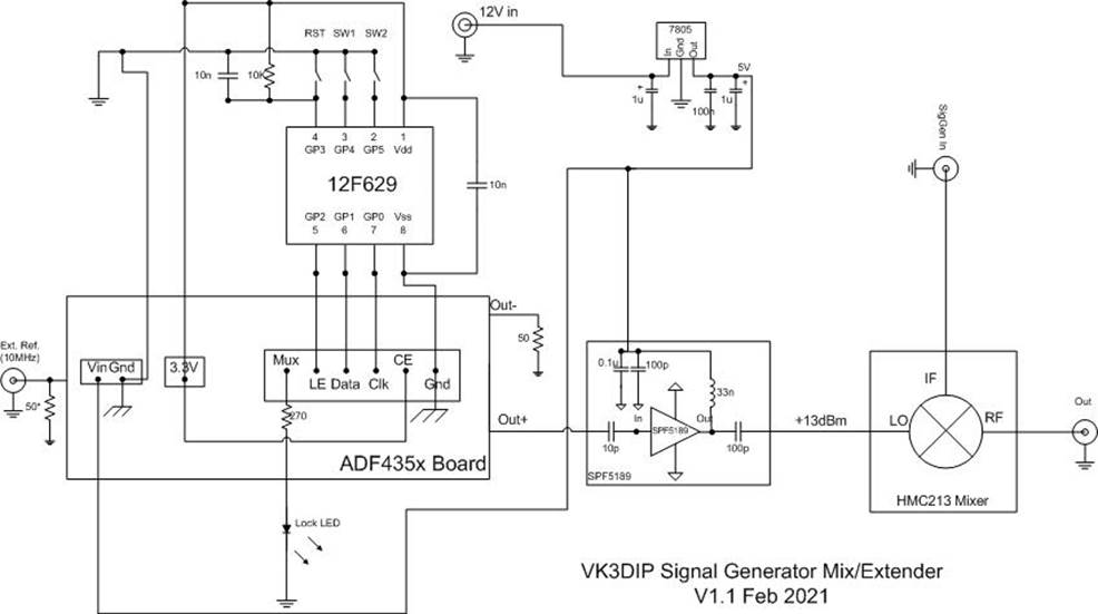 Details of the ADF4350 board, the PIC programmer, and buffer amp can be found in the previous Nerg news (Nov 2020). The only differences are different frequencies and levels set in the controller, and the addition of a small board with a broadband (HMC213) mixer on it. This mixer board can be found on the usual places (Ebay/Aliexpress) for $3-5 and comes with three SMA connectors.