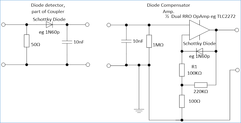 Figure 3. Does also give pointers to how to reduce the errors, as you can see from the orange line with the triangular marks, increasing the DC load resistance to 1MΩ pretty much halves the offset etc. In a passive meter this sort of input resistance is more or less impractical. So you need some sort of buffer amplifier to achieve this sort of value. Which brings us to the grey Diamond shaped marker curve. To obtain this curve I used a circuit popularised as a part of the original “Tandem Match” design by John Grebenkemper as published in January 1987 QST and appearing in pretty much every ARRL handbook since. The version I used for these tests and in the rebuilt meters is shown in Figure 4.